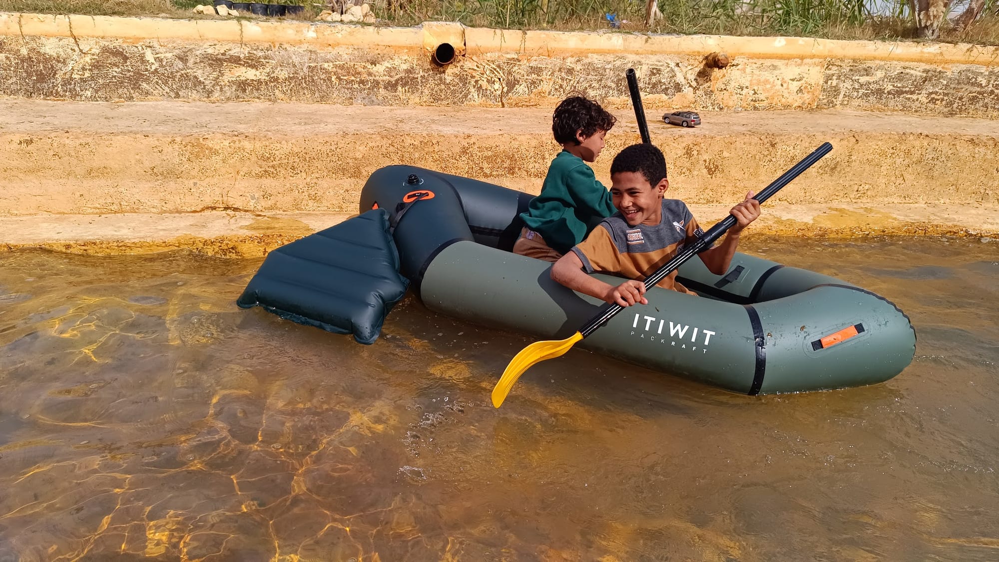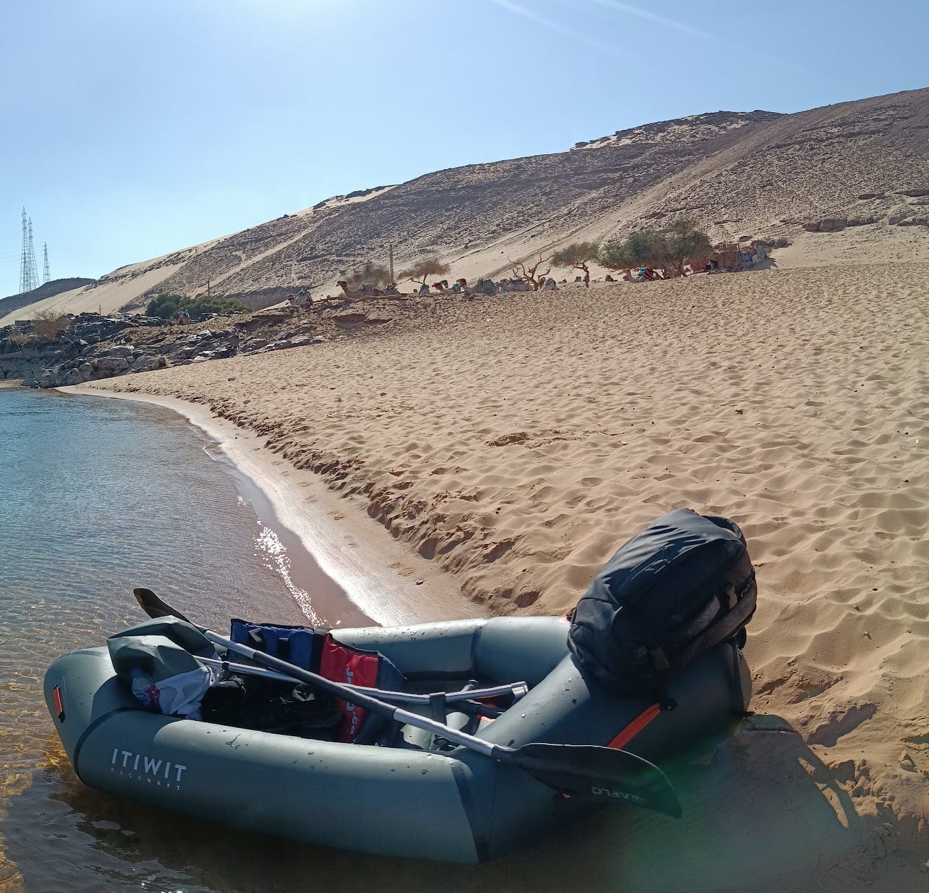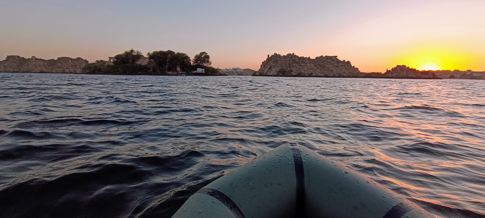 Packraft en el Nilo, Egipto, Asuan Kayak hinchable en un lugar especial, las aguas del río Nilo cerca de Aswan. Ruta alrededor de las islas: Sehel, Isis y Elefantina